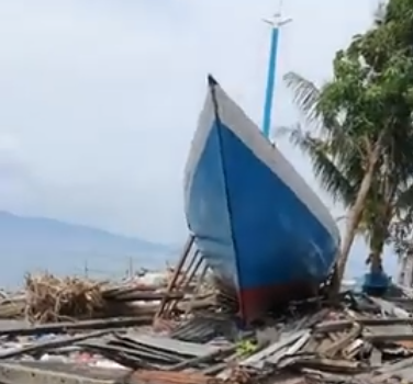 Paparan menunjukkan kapal besar telah naik ke darat ketika berlakunya Tsunami di Palu. Meskipun bencana banjir besar berlaku, namun masjid masih lagi berada dalam keadaan baik dengan sedikit kerosakan. Buktinya cermin tingkap masjid masih elok, namun persekitaran masjid semuanya hancur binasa dipukul Tsunami.