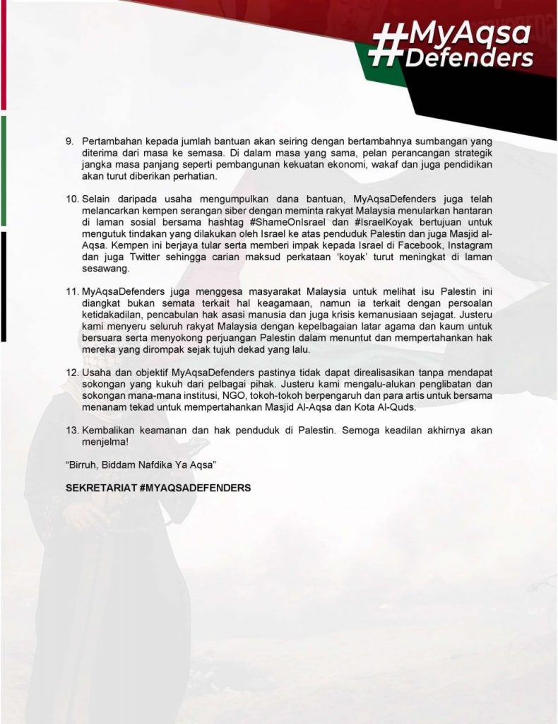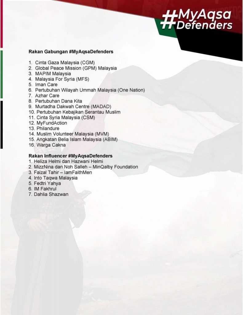Intipati Sidang Media Penubuhan Gabungan MyAqsaDefenders Leave a Comment / Palestin / By Yayasan Amal Malaysia Yayasan Amal Malaysia di wakili oleh Duta Rasminya, Imam Muda Fakhrul sebagai penggerak influencer.